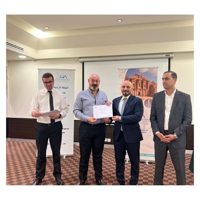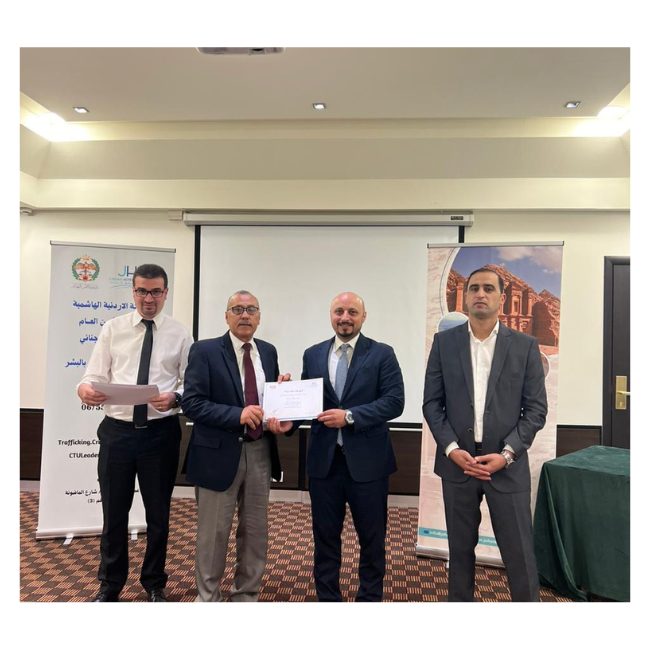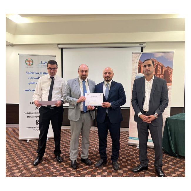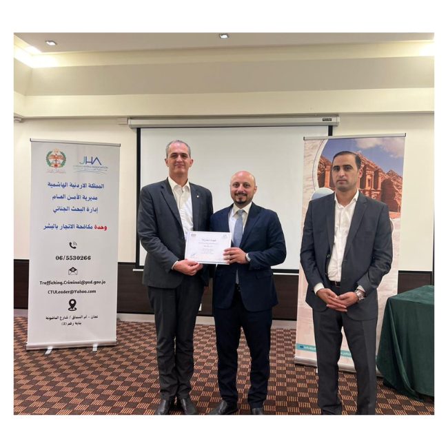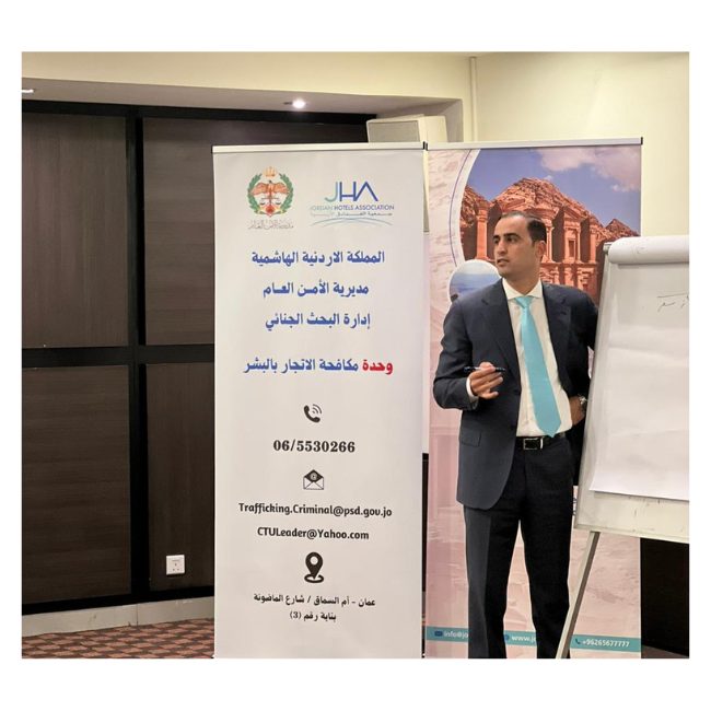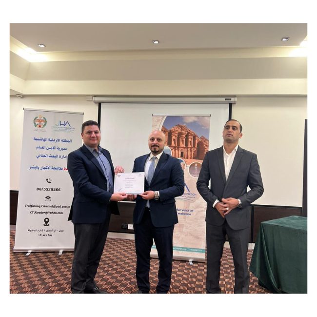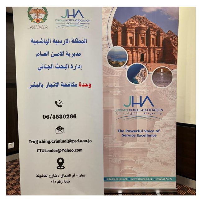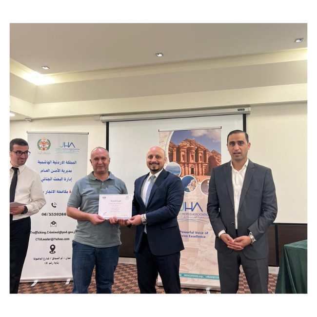 بالتعاون مع جمعية الفنادق الأردنية، اجتازت المنشآت الفندقية من فئة الخمسة نجوم والأربعة نجوم في العاصمة عمان الدورة التدريبية المتخصصة في مكافحة الاتجار بالبشر، والتي نظمتها وحدة مكافحة الاتجار بالبشر التابعة لإدارة البحث الجنائي.