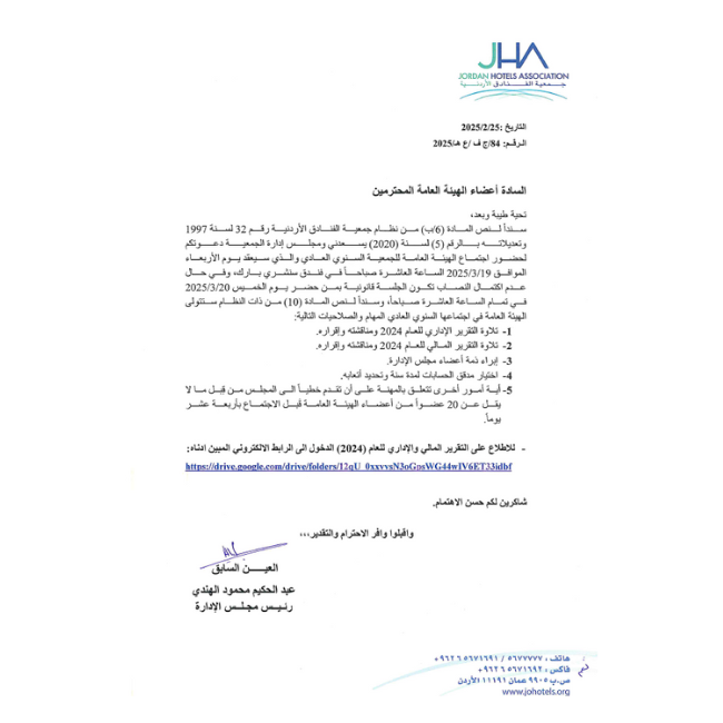Invitation to Attend the Annual General Assembly Meeting of the Jordan Hotels Association