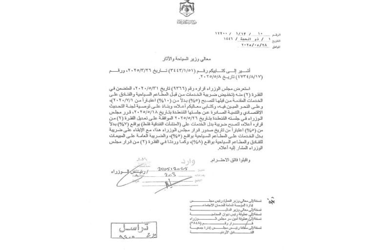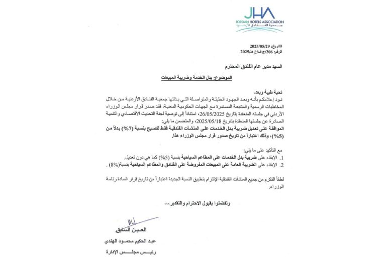 The Association has issued official letters to hotel managements across Jordan, informing them that the Cabinet’s decision has been in effect since its issuance on the 26th of this month.