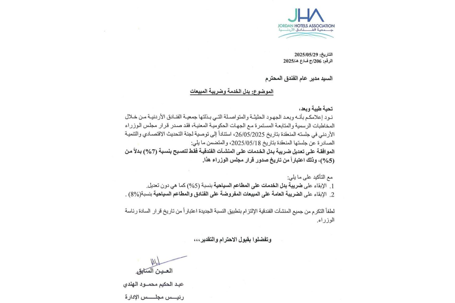 The Chairman of the Jordan Hotels Association, former Senator Engineer Abdul-Hakim Mahmoud Al-Hindi, along with the Board members of the Association’s, expressed their appreciation for the recent Cabinet decision to amend the service tax in Jordanian hotel establishments from 5% to 7%.