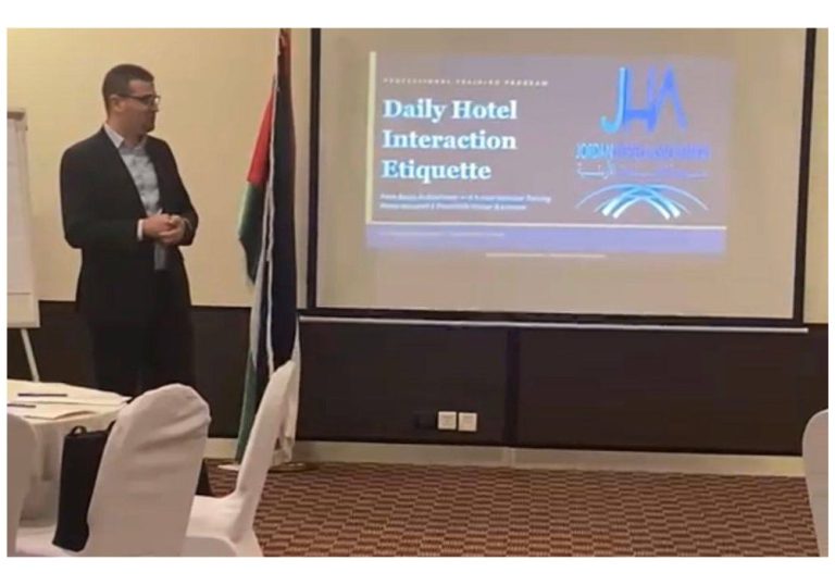 The Jordan Hotels Association conducted a training course entitled “Daily Etiquette in Hotels” on 8 April 2026, delivered by trainer Kenan Karasneh, with the participation of a number of hotel sector employees from guest-facing departments, including front office, food and beverage, and housekeeping.